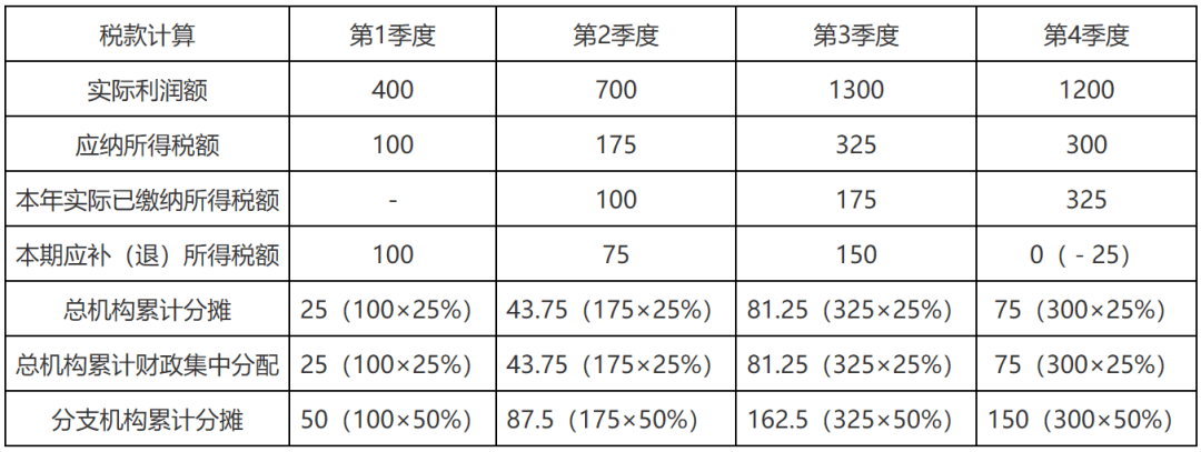 一是调整总分机构税款分摊计较方式。将汇缴环节总分机构分摊税款计较方式推广至预缴环节,即企业先对截止到本月(季)度应纳所得税额进行分摊,再由总、分机构别离抵减其已分摊预缴税款,并计较本月(季)度应补(退)所得税。举例申明如下。
